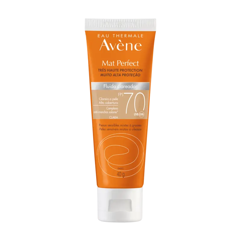 o anti-manchas¹. Ele atua clareando as hiperpigmentações existentes, prevenindo novas manchas e uniformizando as diferenças de tonalidade da pele. Assim, garantindo um efeito clareador, além de proteger contra os radicais livres. Com pigmentos corretivos presentes na fórmula, cobre naturalmente as hiperpigmentações, uniformizando o tom da pele.Mat Perfect Fluido Clareador é indicado para as peles sensíveis, mistas a oleosas e com hiperpigmentações.Principais benefícios:- Clareia a pele- Previne novas manchas- Uniformiza a tonalidade da pele- Textura leve com toque aveludado- Matifica a pele por 12h²- Muito Alta Proteção contra os raios UVB, UVA e luz visível- Enriquecido com vitamina E