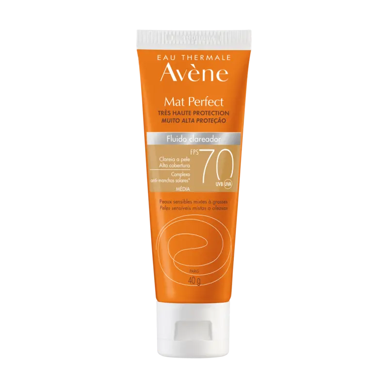 Mat Perfect Fluido clareador FPS 70 é um protetor solar com muito alta proteção contra os raios UVB, UVA e que traz um benefício da ação clareadora que ajuda a clarear, prevenir e uniformizar manchas. Sua fórmula matifica a pele por 12h².Com o seu poderoso Complexo Clareador e antioxidante, HMC + Dextran, Mat Perfect fluido Clareador possui tripla ação anti-manchas¹. Ele atua clareando as hiperpigmentações existentes, prevenindo novas manchas e uniformizando as diferenças de tonalidade da pele. Assim, garantindo um efeito clareador, além de proteger contra os radicais livres. Com pigmentos corretivos presentes na fórmula, cobre naturalmente as hiperpigmentações, uniformizando o tom da pele.Mat Perfect Fluido Clareador é indicado para as peles sensíveis, mistas a oleosas e com hiperpigmentações.Principais benefícios:- Clareia a pele- Previne novas manchas- Uniformiza a tonalidade da pele- Textura leve com toque aveludado- Matifica a pele por 12h²- Muito Alta Proteção contra os raios UVB, UVA e luz visível- Enriquecido com vitamina E