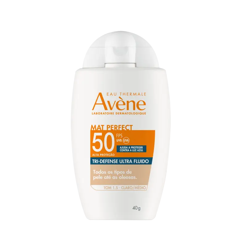 Mat Perfect Tri- Defense Ultra Fluido FPS50 Tom 1.5 é o primeiro protetor solar de muito alta proteção contra raios UVB, UVA curtos e longos até a Luz Azul (450 nm), indicado para todos tipos de pele até as oleosas.AJUDA A PROTEGER CONTRA DANOS AO DNA CAUSADOS PELA LUZ AZULTECNOLOGIA QUE PREVINE A FORMAÇÃO DE MELASMAACABAMENTO INVISÍVEL NA PELECOBERTURA LEVE E NATURAL, INDICADO PARA OS FOTOTIPOS I A V¹ -72% Hiperpigmentação provocada pela luz azul² -95% Lesões ao DNA causadas pela luz azul